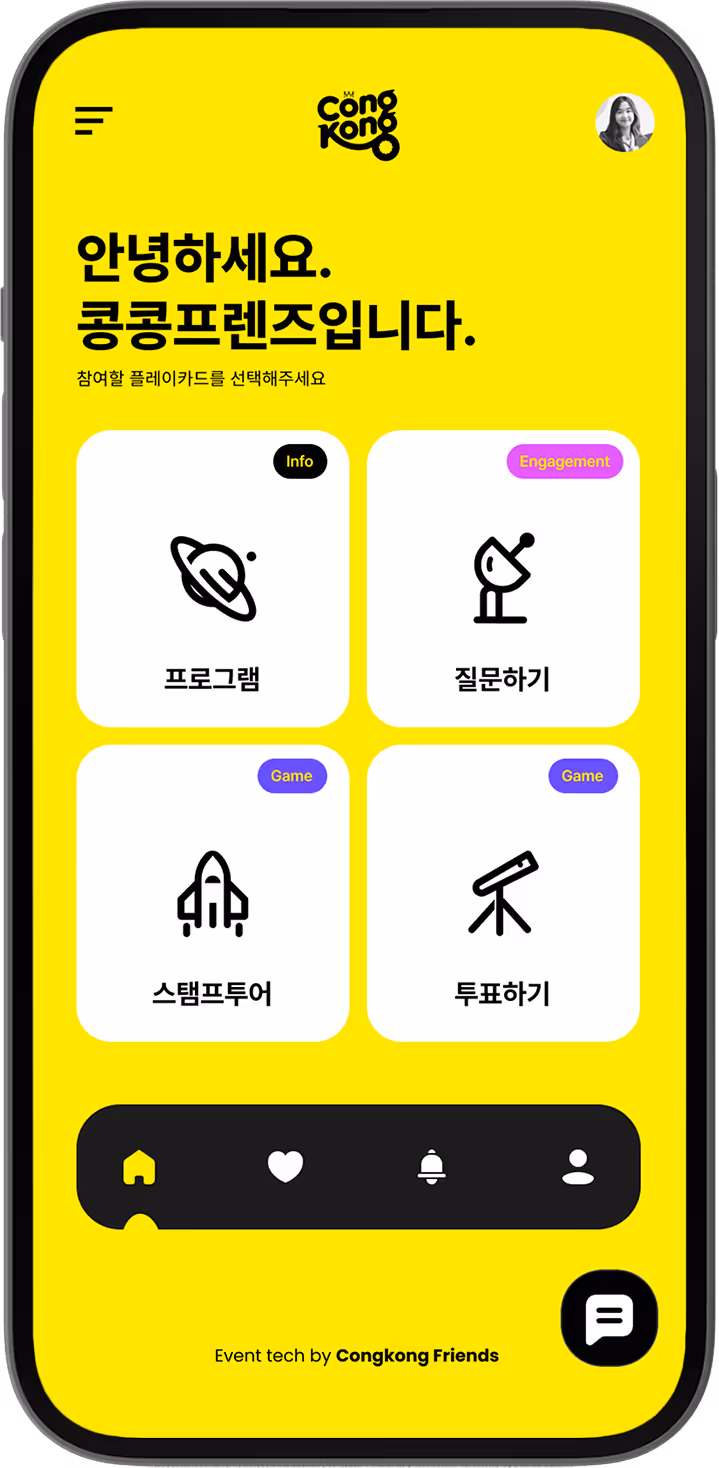 몰입과 열정의 공간 / 인게이지먼트 플랫폼은 콩콩프렌즈만의 독창적인 기능으로 참가자의 몰입과 참여를 증진시키는 다양한 이벤트 경험을 제공합니다.